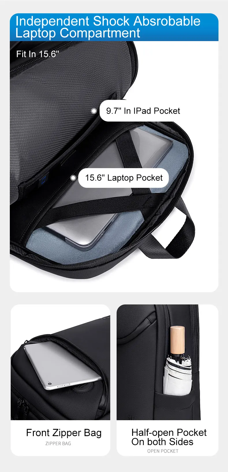 • Compartiment pour ordinateur portable : conçu pour accueillir jusqu’à 15,6 pouces.